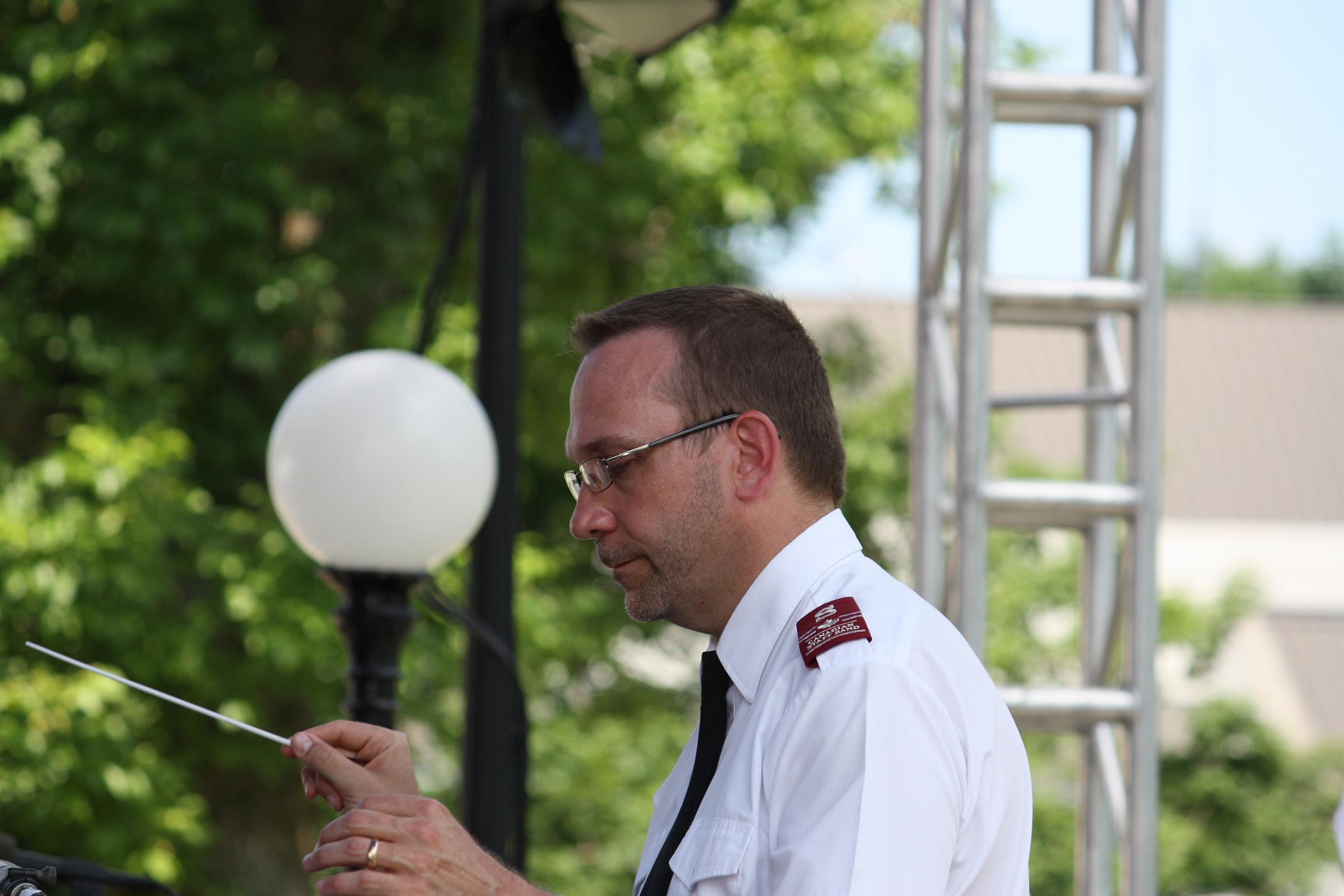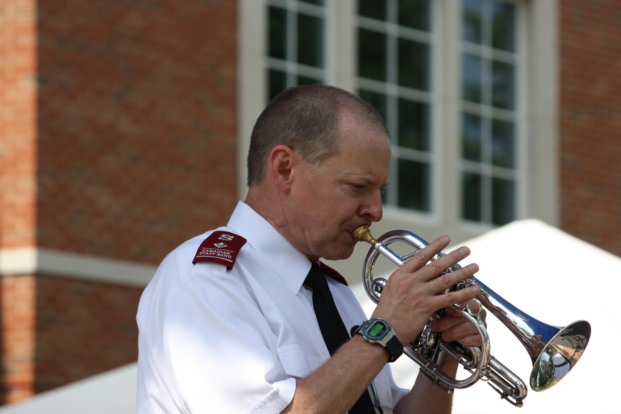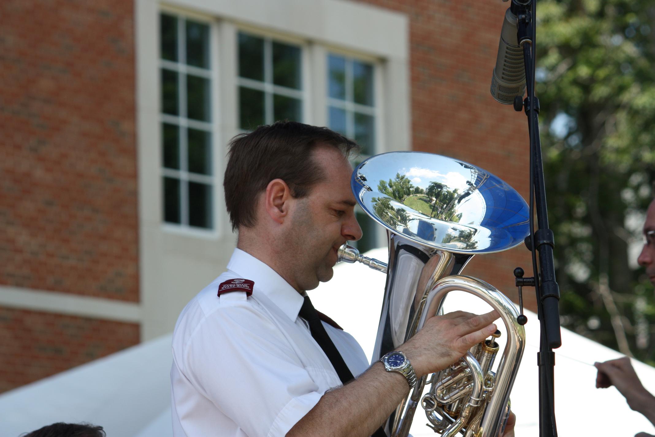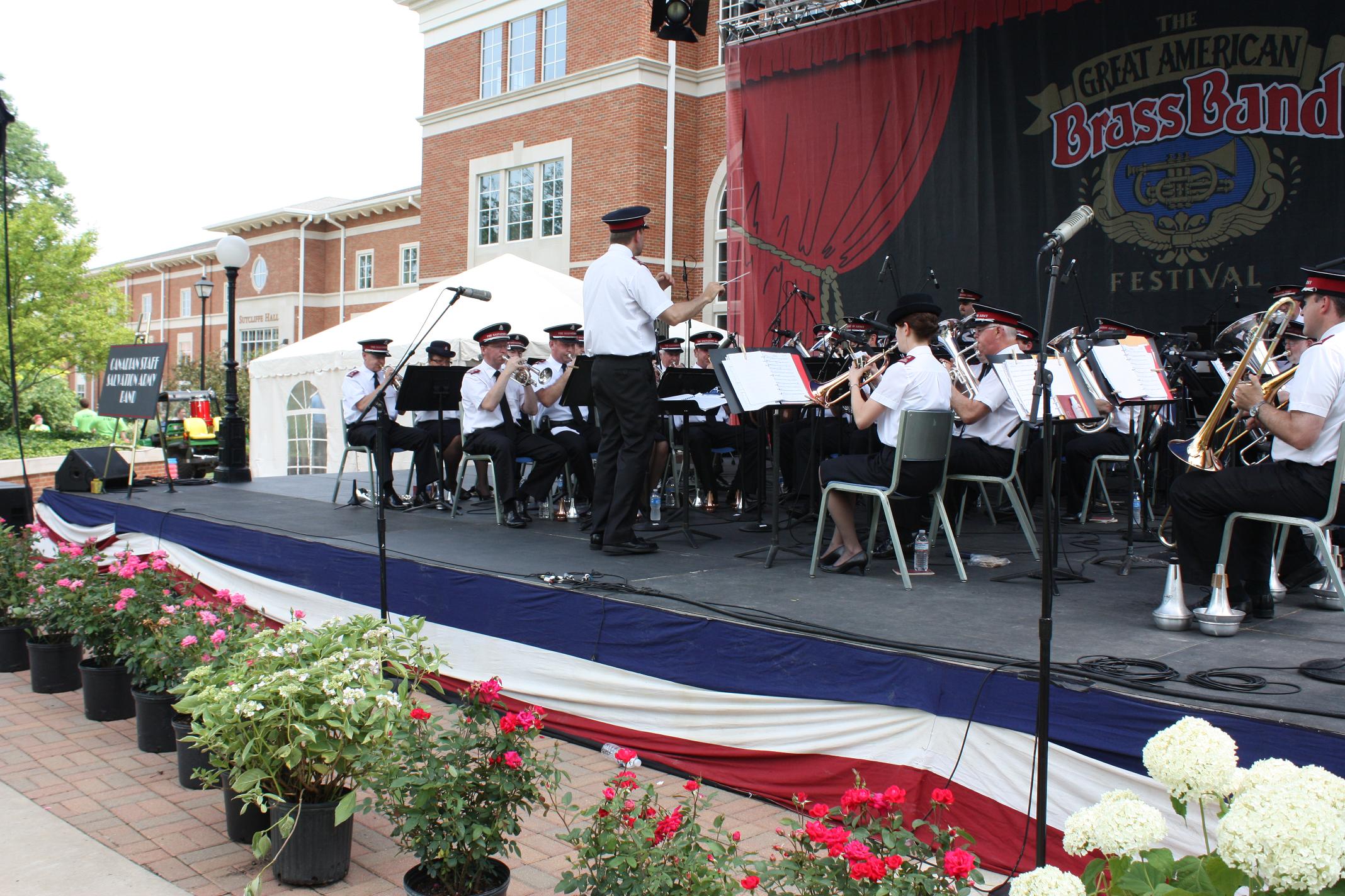 The weekend of June 11-13, the CSB was privileged to participate as one of the guest bands at the 2010 Great American Brass Band Festival. Commencing in 1990, the event is held annually in Danville, Kentucky, and features a wide variety of brass bands, a hot-air balloon race, a colourful parade down the main street, a picnic and other activities. Each year up to 40,000 people travel to the small town (population 15,000) for the event. Bands play at various venues where people can spread out on the spacious grounds of Centre College, soak up the sun and enjoy the festivities. A highlight is the ecumenical worship service on Sunday morning, always accompanied by a Salvation Army band and featuring a community choir drawn from area churches. Most CSB members had been there previously, either with the CSB during its previous visit in 1999, or with their own corps band. It was a long bus ride there and back from Toronto, but all agreed it was well worth it to take in this marvellous musical extravaganza.